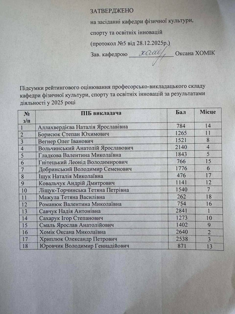 Підсумки рейтингового оцінювання науково-педагогічних працівників кафедри документознавства та інформаційної діяльності за результатами діяльності у 2024 році